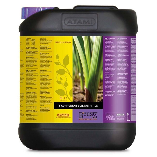 Fortalezca su cultivo en tierra con Atami B'cuzz Alimento para Tierra 1 Componente 5 Ltr. Este avanzado nutriente bio-mineral está especialmente desarrollado para sustratos ricos en cal, permitiendo que sus plantas crezcan y florezcan de manera óptima. La fórmula única, sin sustancias de lastre, asegura una perfecta absorción por la planta.